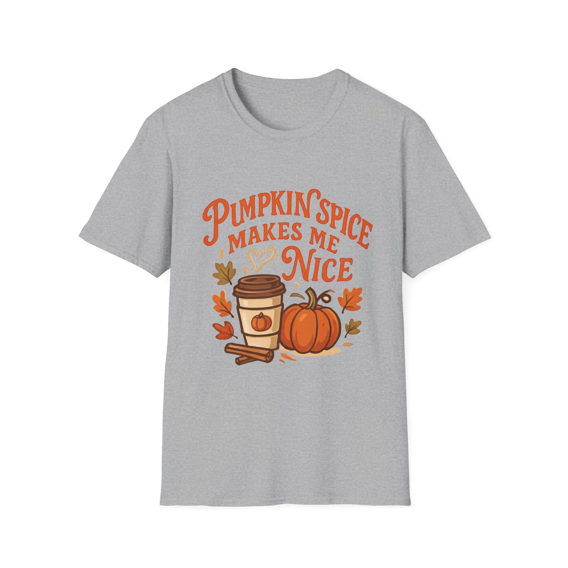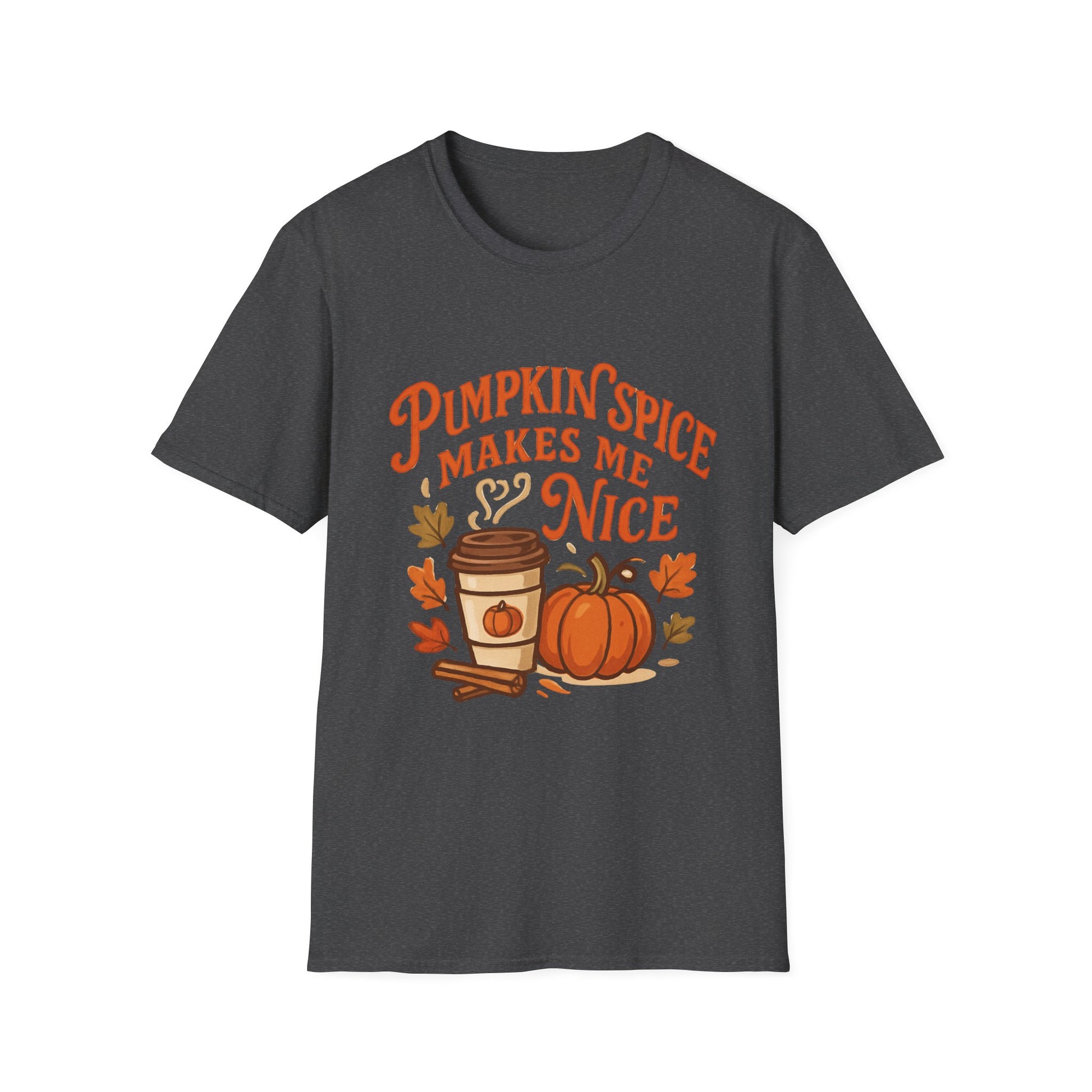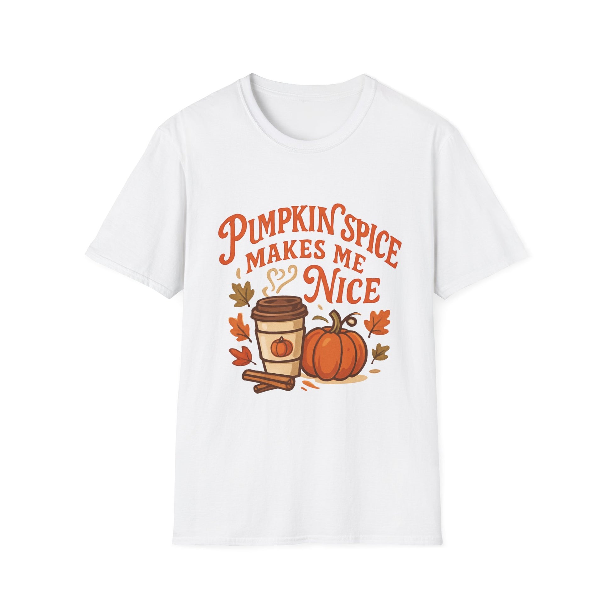 Embrace your love for fall with the “Pumpkin Spice Makes Me Nice” T-Shirt, the perfect blend of cozy comfort and seasonal sass!