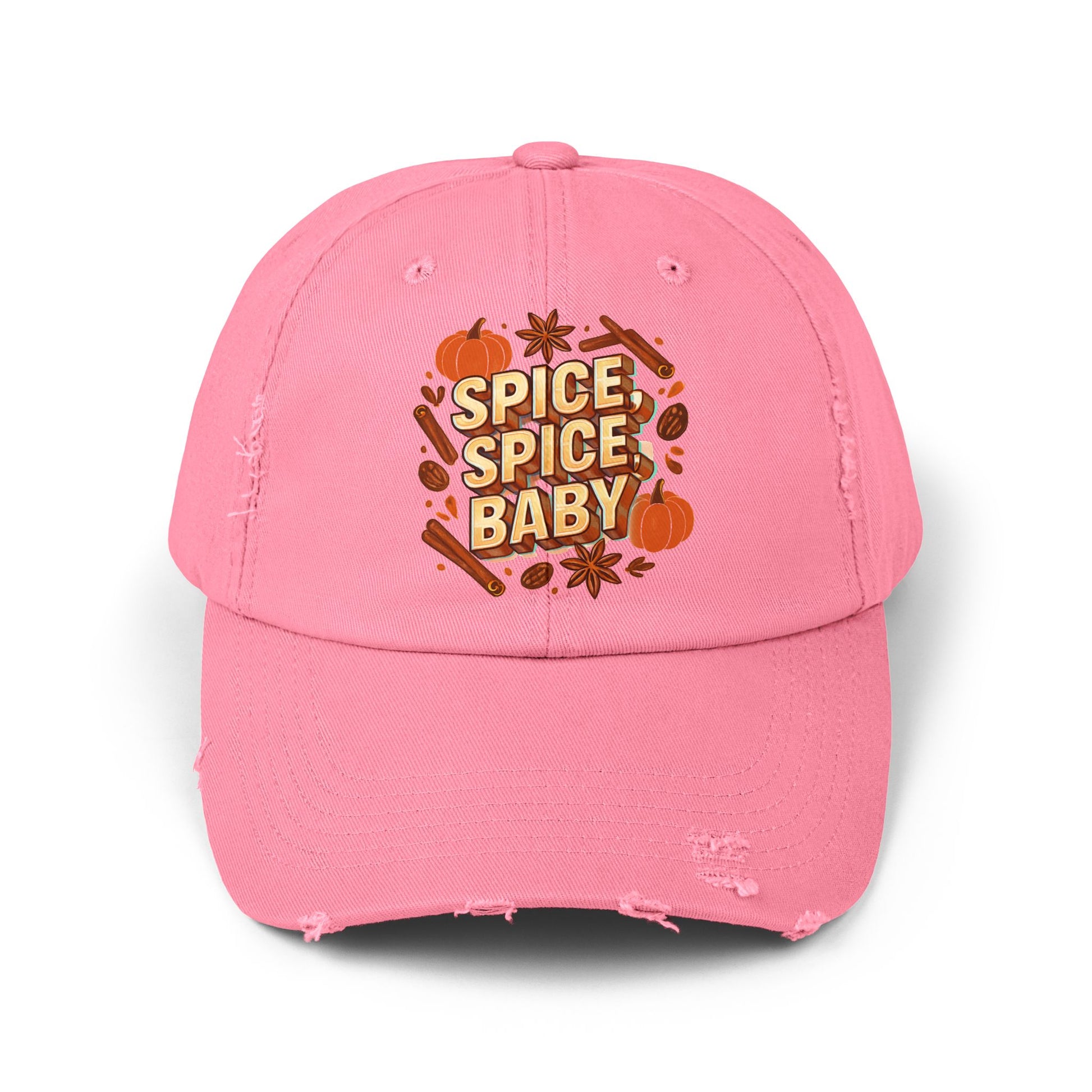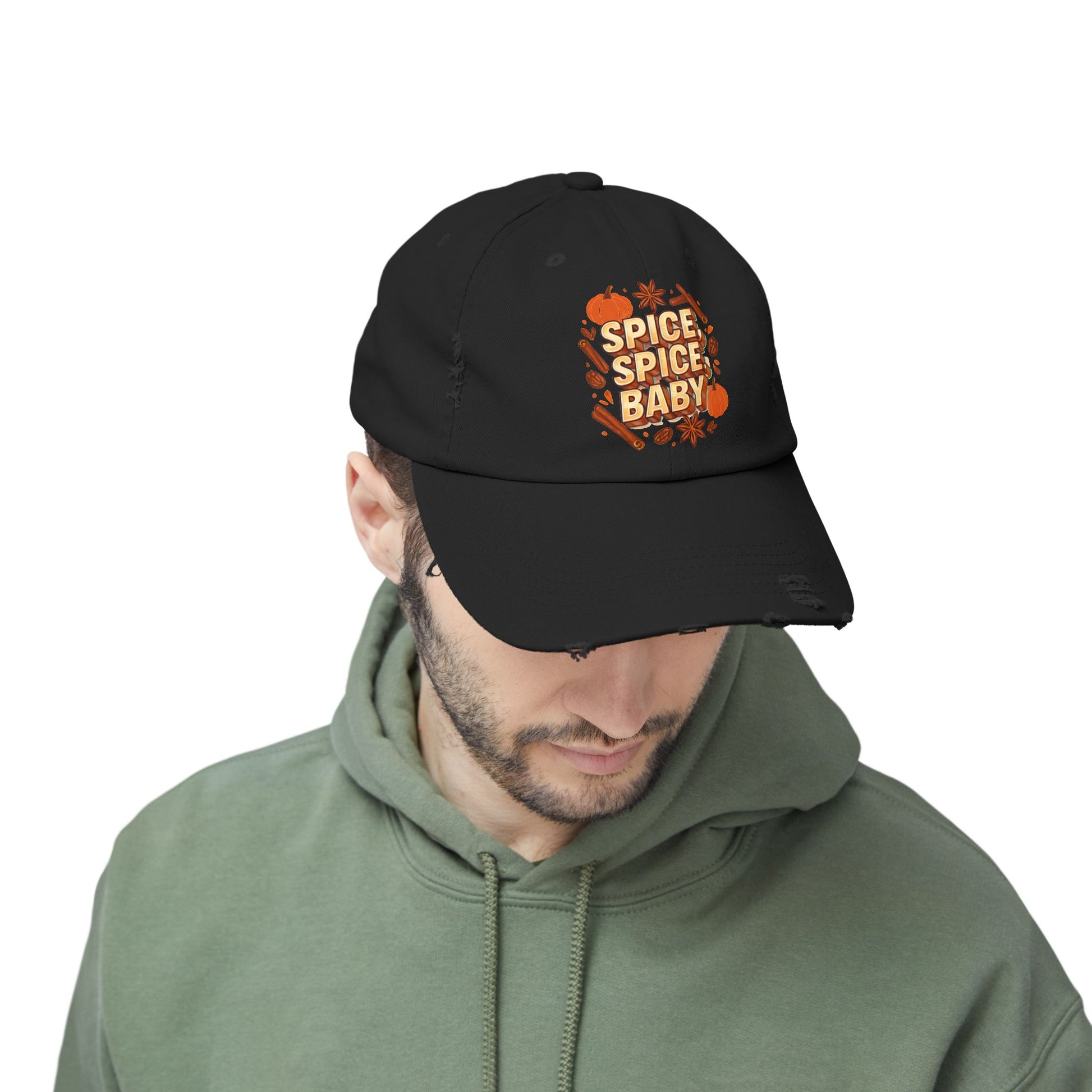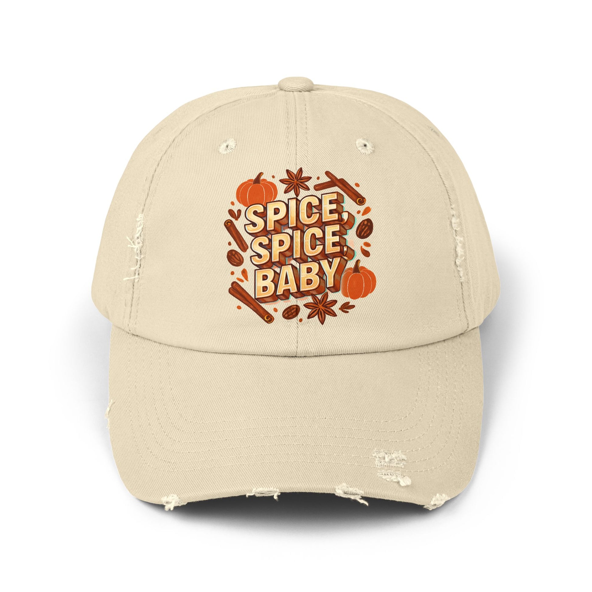 Add a splash of 90s nostalgia and fall spice to your outfit with the “Spice Spice Baby” Distressed Cap! Perfectly weathered for that vintage look, this unisex cap combines comfort with attitude for an everyday staple.