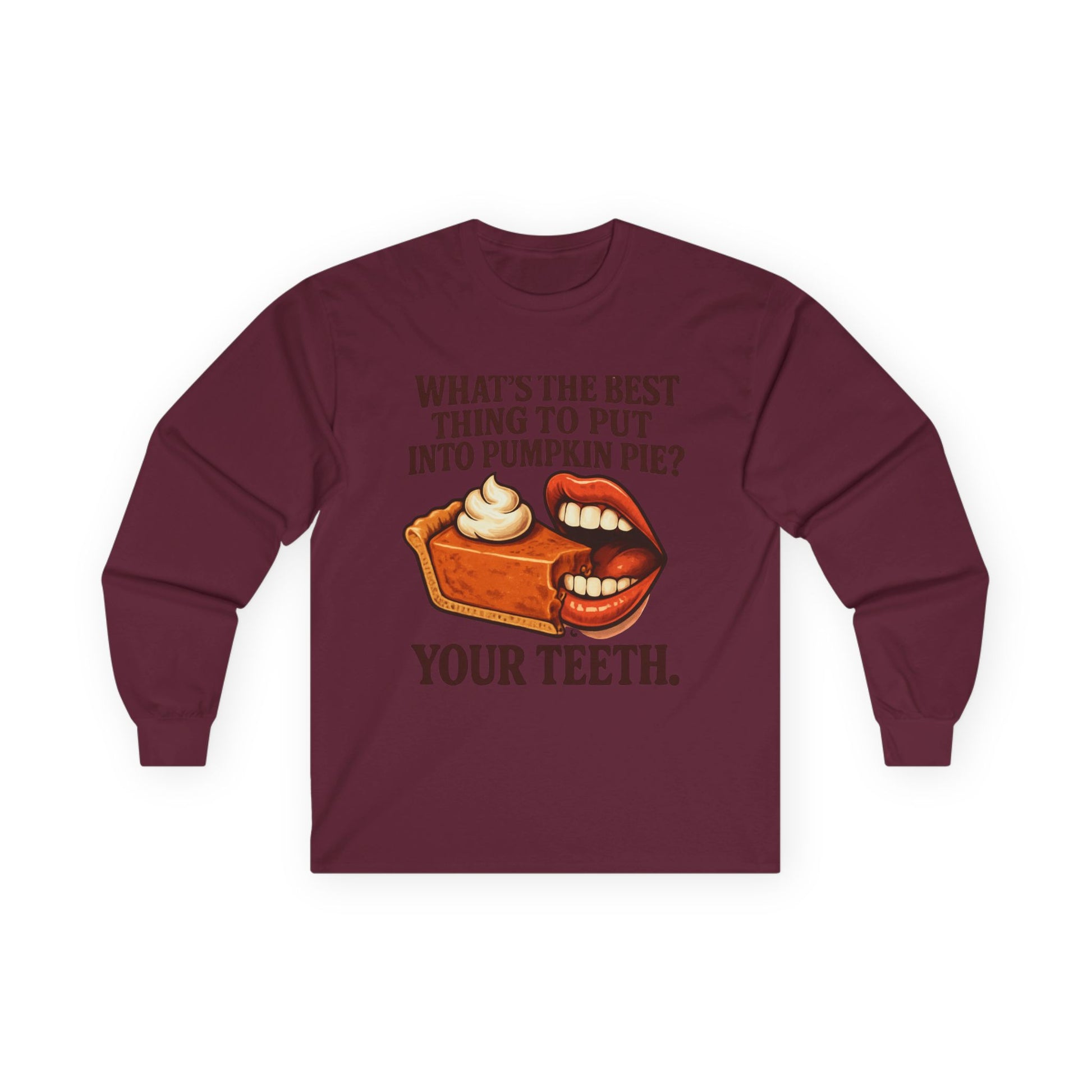 Add a slice of humor to your autumn wardrobe with the "What’s the best thing to put into pumpkin pie? Your teeth." long sleeve shirt! This playful, cozy tee is baked to perfection for pie lovers and pun enthusiasts alike—guaranteed to spark laughs at every fall gathering, Friendsgiving dinner, or pumpkin patch visit. Crafted for comfort and designed to stand out, it’s the perfect way to show your flavor for wit and seasonal fun all autumn long.