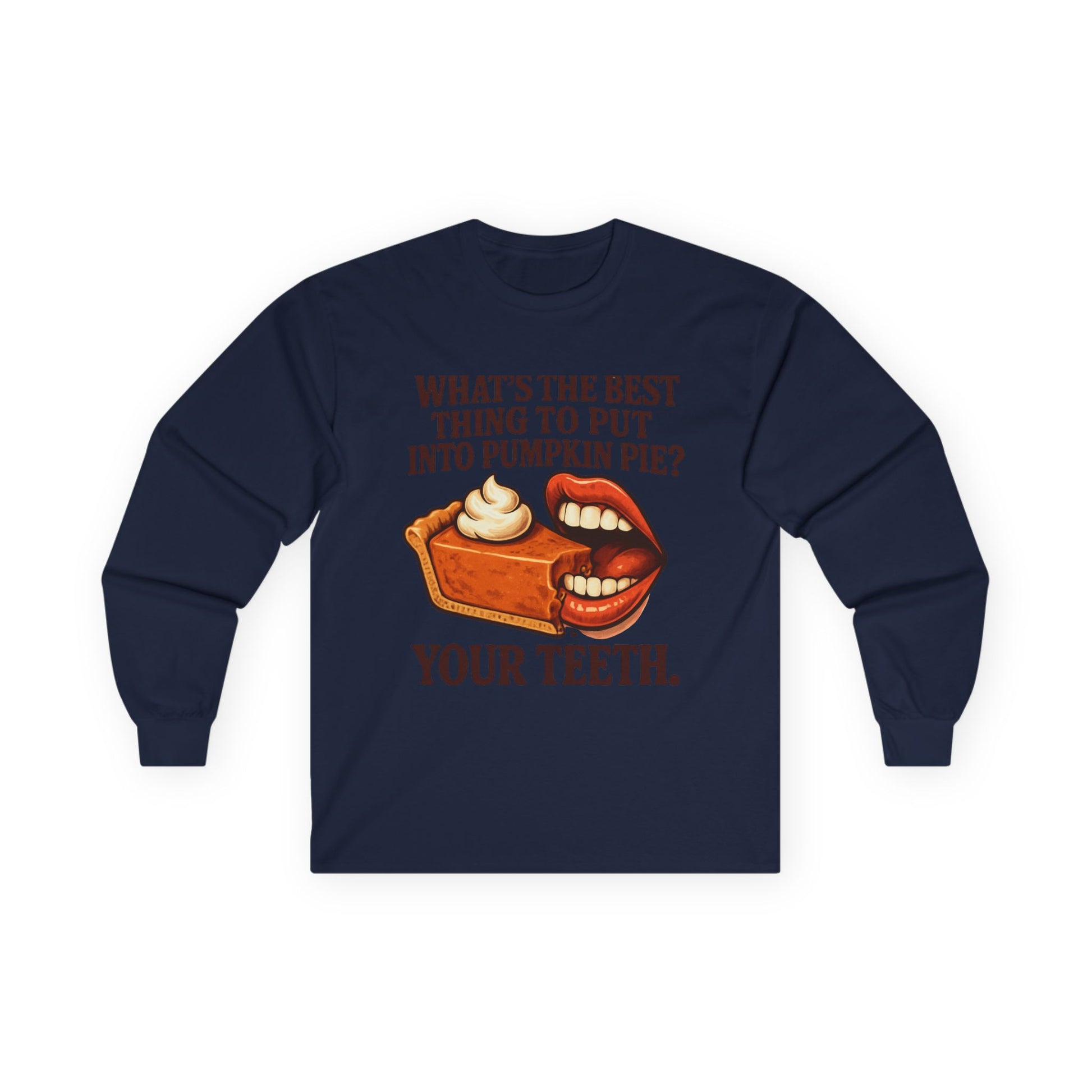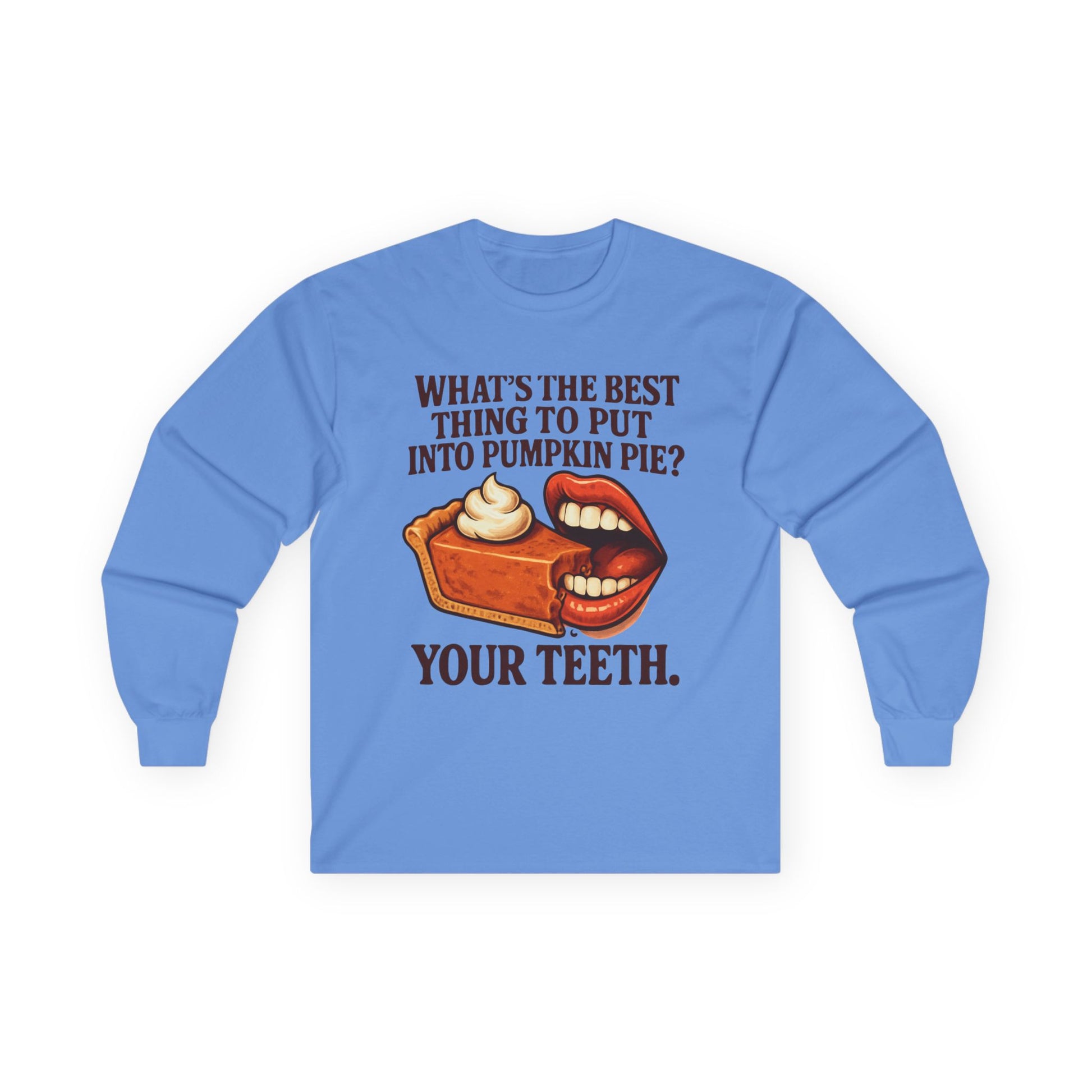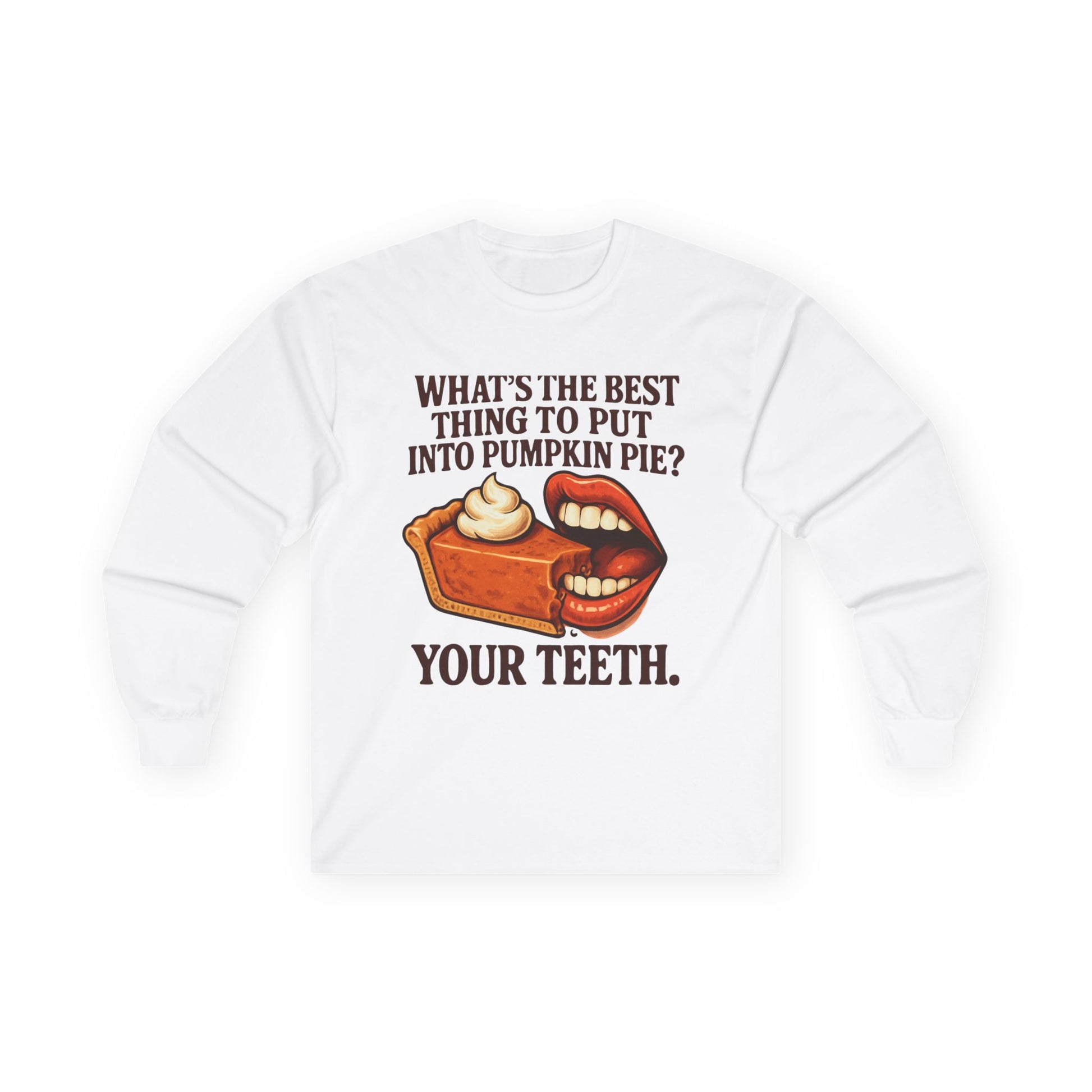 "What’s the best thing to put into pumpkin pie? Your teeth." long sleeve shirt